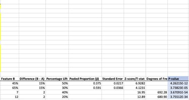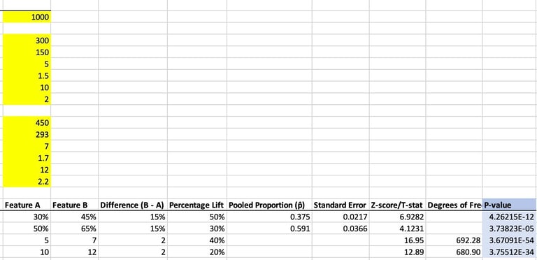 A/B test model template I use for feature adoption and stickiness tests: I calculate statistical significance (p-value) using z-scores for proportional variables (e.g., adoption, retention) and t-statistics for continuous variables (e.g., usage frequency, session duration). Click the image above to download the .xlsx file.