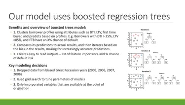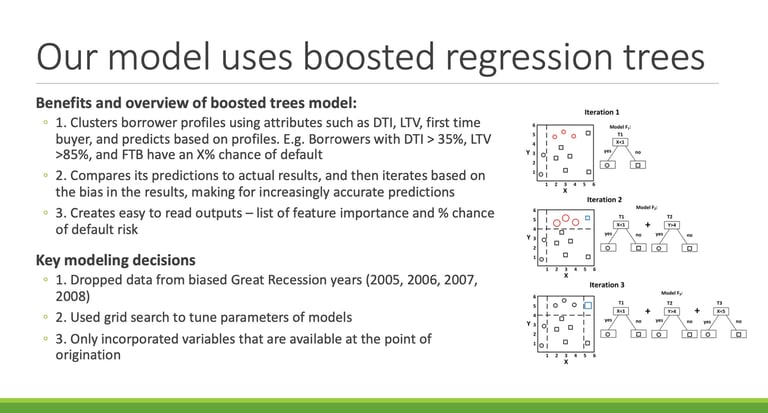 At the University of Virginia, I developed a boosted regression trees model using python and datasets from Fannie Mae to better predict default probabilities.