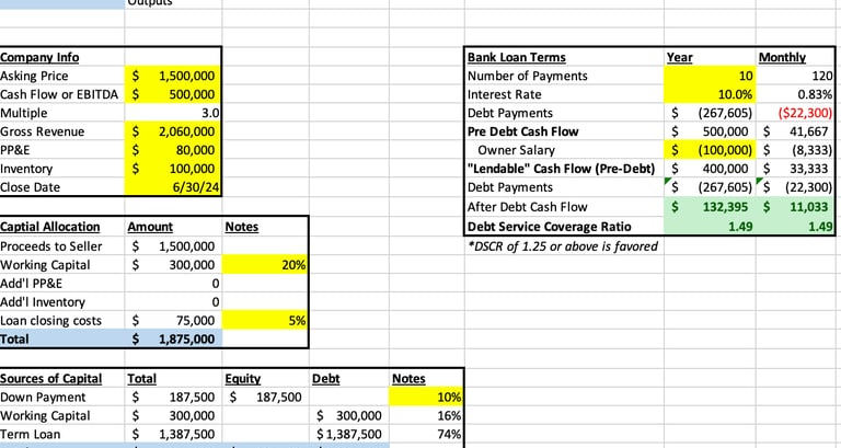 Ever catch yourself scrolling BizBuySell at 2 a.m., wondering what would happen if you went all-in on a laundromat? Me neither. If you did, though, you could use this model to plug in values like asking price and revenue, then see after-debt cash flow, loan payment schedule, and a five-year forecast. Click the image to download the.xlsx . Remember to do your own due diligence!