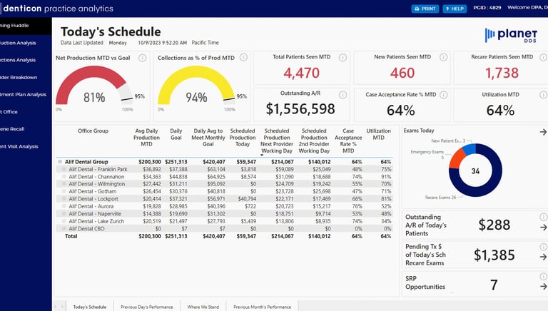 Denticon Practice Analytics is a comprehensive analytics suite offering over 100 KPIs, interactive dashboards, and personalized benchmarks to boost productivity, efficiency, and patient care in a dental practice and dental organization. Morning Huddle Demo Video.